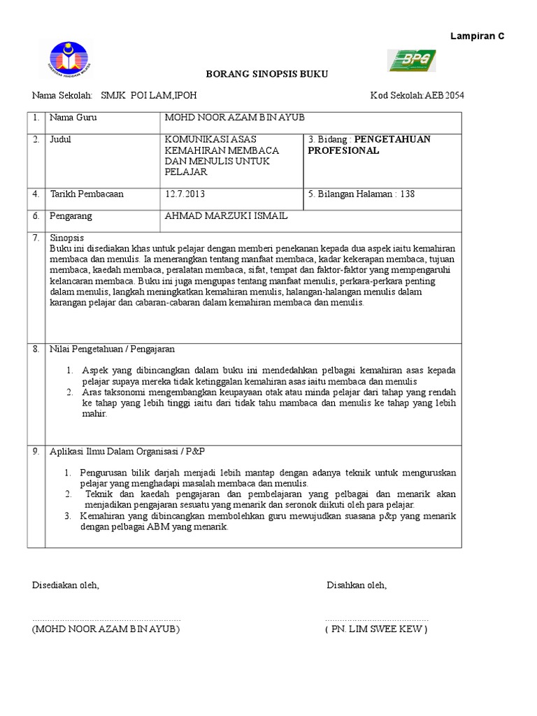 Borang sinopsis buku nama sekolah. Contoh book review e splg. Contoh laporan ladap kursus penyebaran dskp rbt t6 2015.